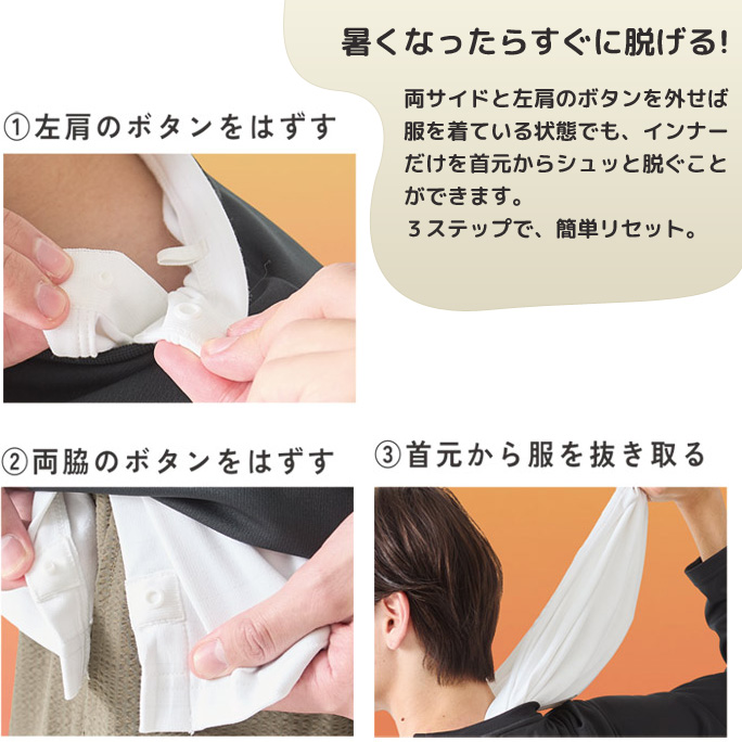 両サイドと左肩のボタンを外せばTシャツを着たままシュッと脱ぐことができる。