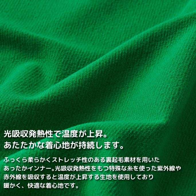 光吸収発熱性をもつ特殊な糸を使った紫外線や赤外線を吸収すると発熱する生地を使用しており、暖かく、快適な着心地。