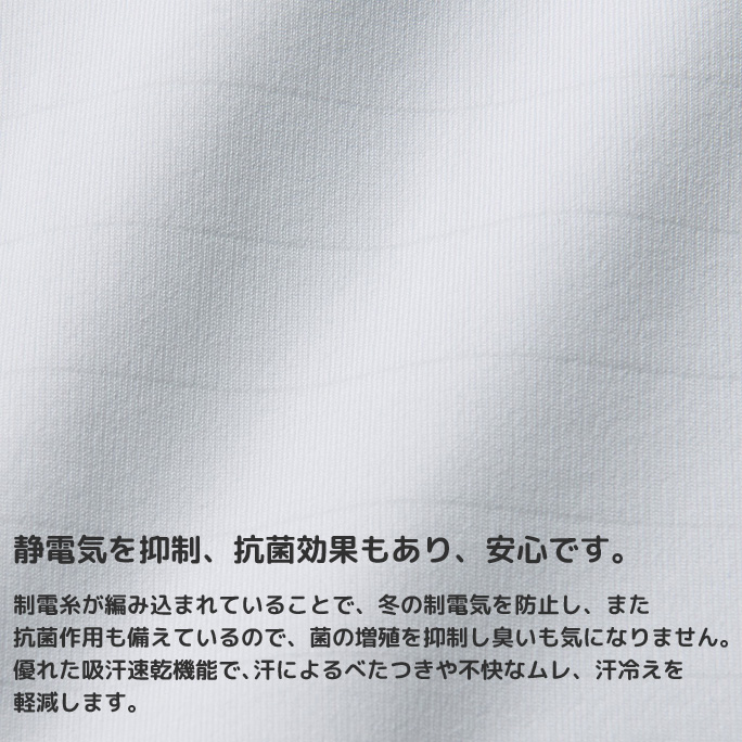 制電糸が編み込まれていることで冬の制電気を防止しまた、抗菌作用も備えているので、菌の増殖を抑制し、気になる臭いなども抑制します。