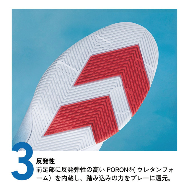 軽量性とクッション性を両立したアウトソールを採用。前足部に反発弾性に優れた"PORON"を搭載し、踏み込みのパワーをプレーへ還元します。フェイントやクイックなプレーなど瞬発力が求められるスピードプレイヤーにおすすめのハンドボールシューズ。