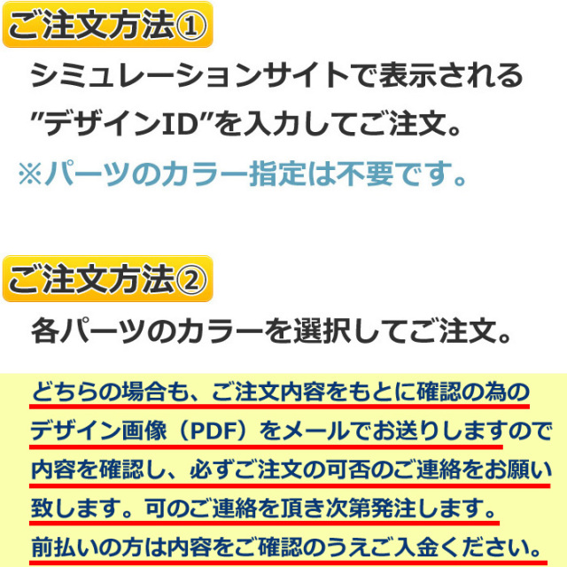 各パーツのカラーを選択してご注文ください。完成予想図を作成し、メールに添付しお送り致します。