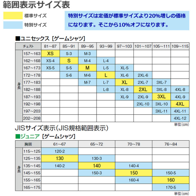 サイズ表に記載されていないサイズは、採寸サイズとなり、約4割増しの価格になります。