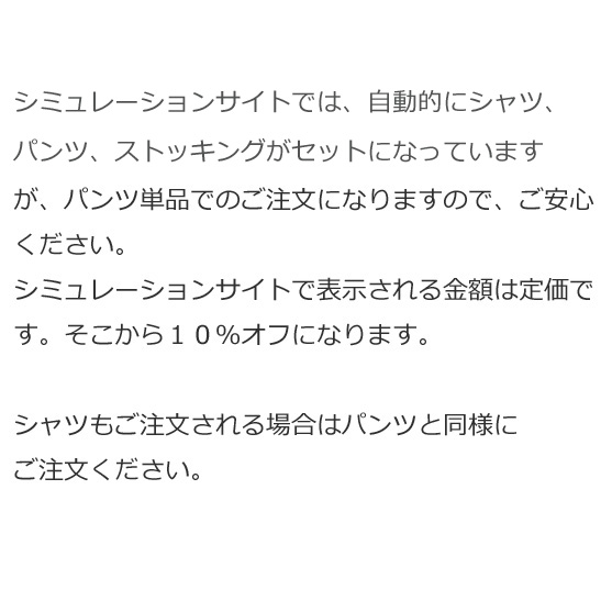 ※シミュレーション上では、自動的にシャツとパンツとストッキングがセットになっていますが、当店のホームページでパンツ単品のご注文となりますのでご安心ください。